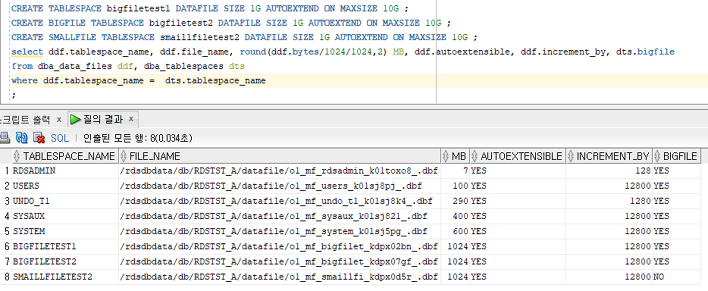 select ddf.tablespace_name, ddf.file_name, round(ddf.bytes/1024/1024,2) MB, ddf.autoextensible, ddf.increment_by, dts.bigfile
